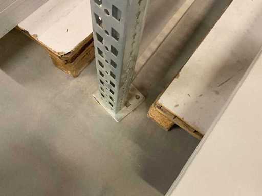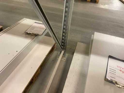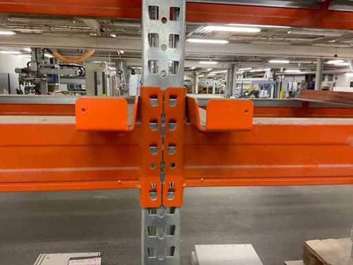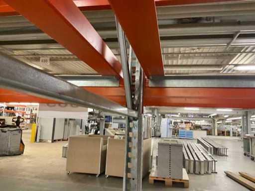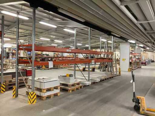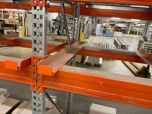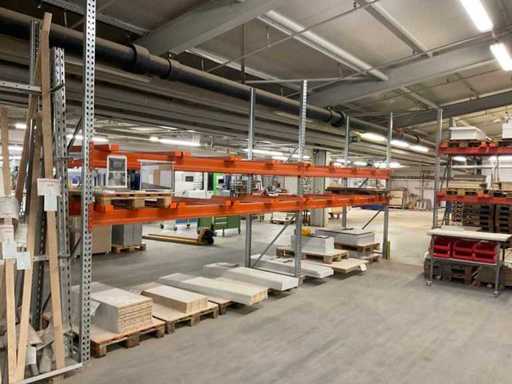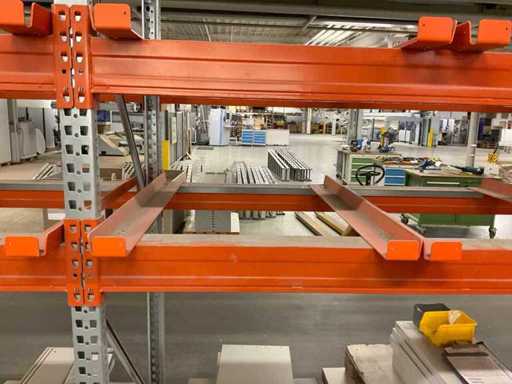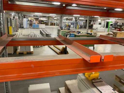 Zware plank bestaande uit: 3 standaards ca. 1100x3300mm, 8 vakwerkten circa 3600mm, inclusief pallethouders, met inhoud