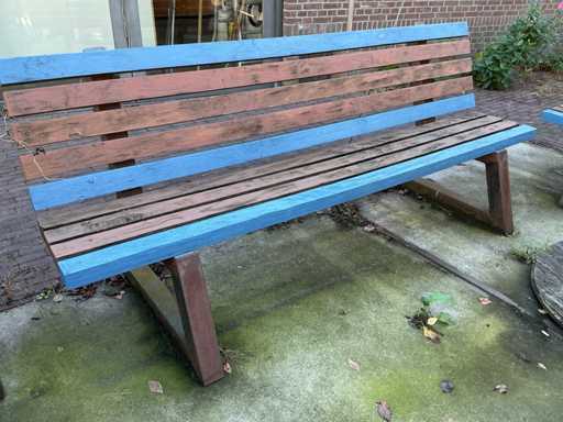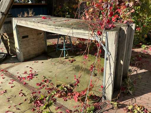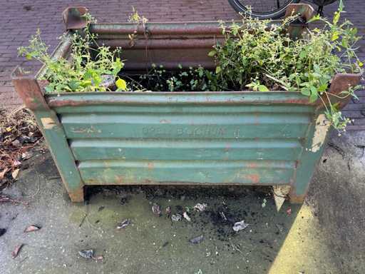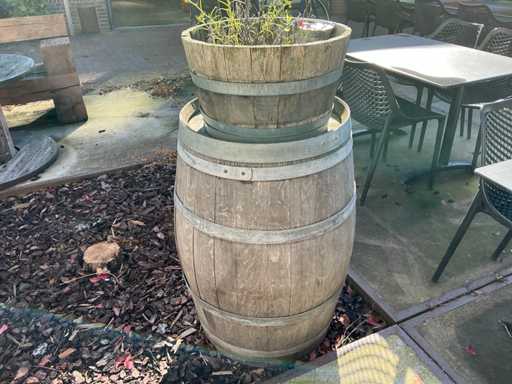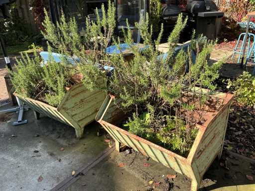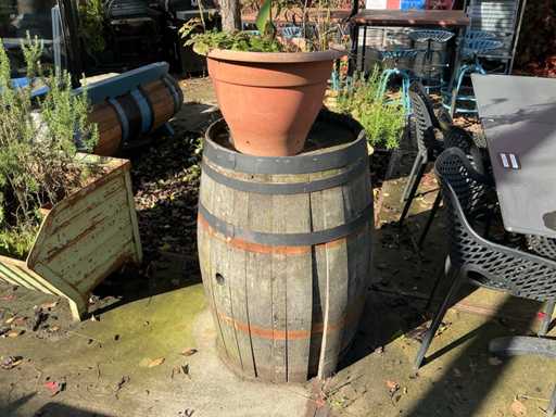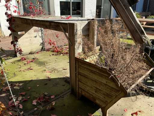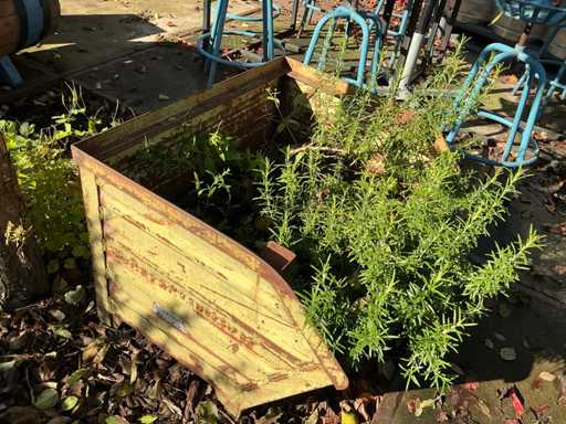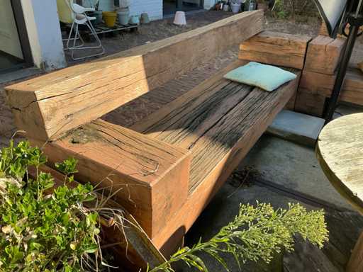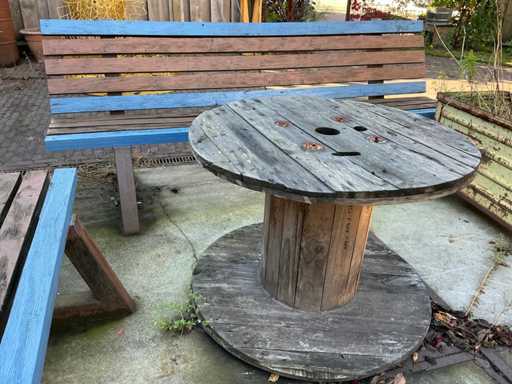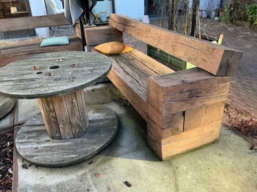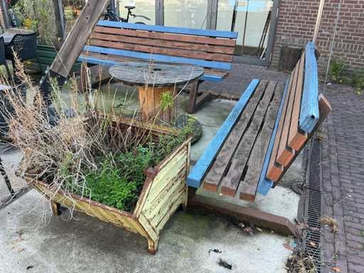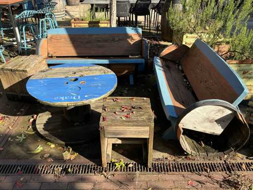 Składa się z 2x ławki z podkładami 250x65x85cm; 2x ławka drewniana ze stalową ramą 242x80x95cm; 2x ławka beczka na wino 165x70x70cm; Stół paletowy 235x89x100cm; 4 x szpula/stół; 9x stalowy kontener, w tym kontener Kruizinga; parasol z podstawą, beczka na deszczówkę
