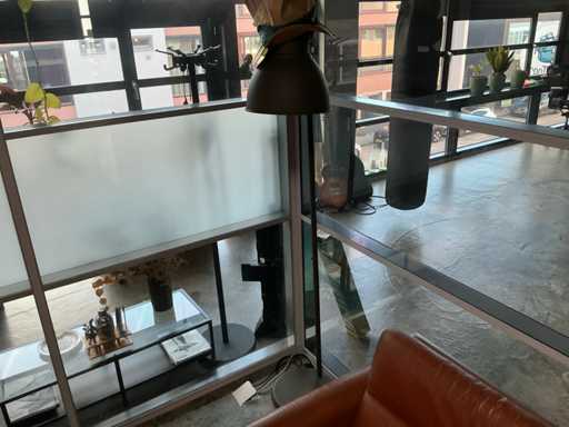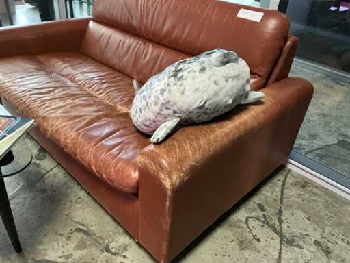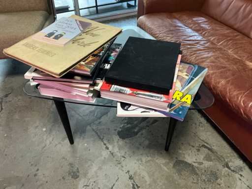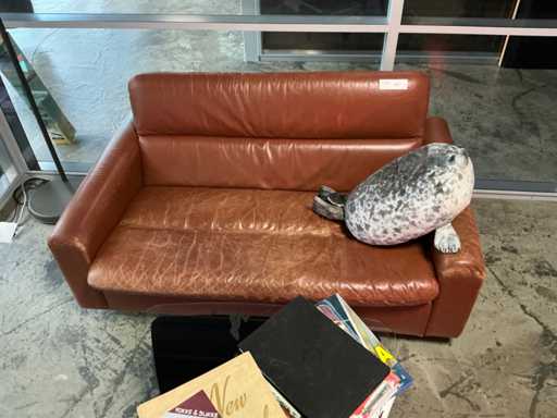 1x skórzana sofa 2 osobowa, z poduszką, 1x stolik kawowy z różnymi książkami. 1x lampa podłogowa