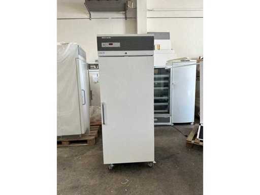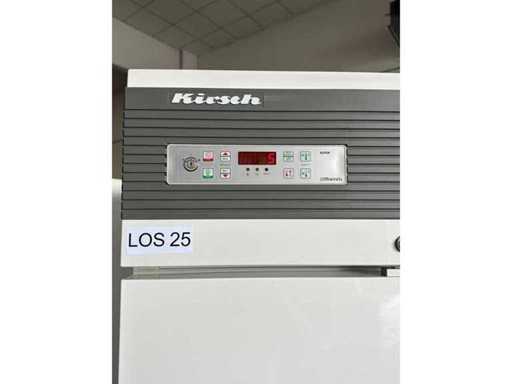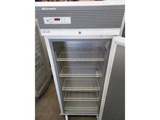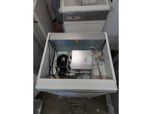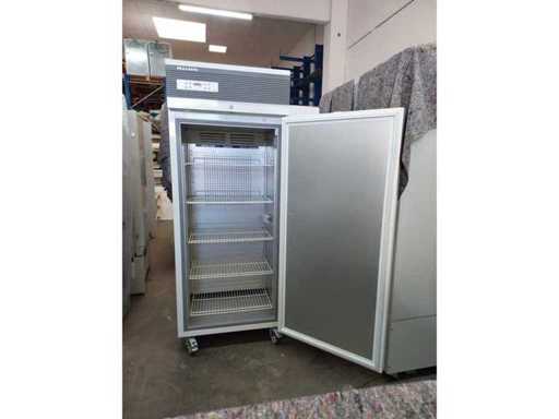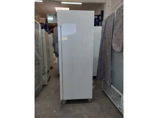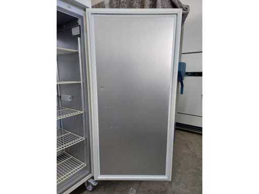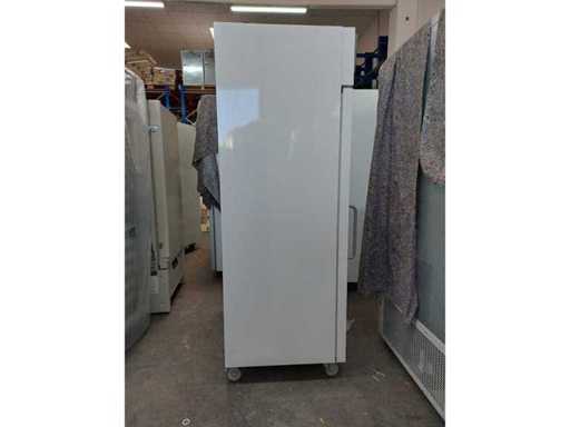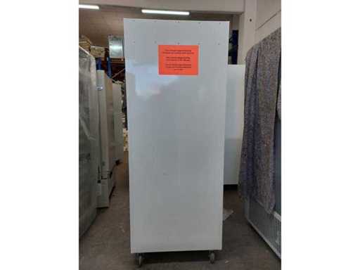 120 kg (net) Mobile version. Monitoring sensor available (temperature documentation, for connection to the building management system) Outer housing made of galvanized sheet steel (rust protection), white, powder-coated. Interior made of smooth aluminium with colourless protective coating. Shelves (15 mm grid) for hooking the interior. 4 plastic-coated grates Insulation 70 mm thick, made of high-quality, pressure-foamed and environmentally friendly material. Energy-saving due to special starch. Door with easily replaceable plastic magnetic seal frame, lockable. Door hinge on the right. Circulating air cooling with cross-flow fan, which switches off automatically when the door is opened, ensures uniform temperature control and reduces the physically induced temperature gradient to a minimum. Automatic rapid defrost via hot gas. Condensation evaporation in a heated stainless steel bowl under the bottom of the refrigerator. Electronic temperature control. The temperature is automatically maintained regardless of changing outside temperatures. Control center with key switch and membrane keypad, digital temperature display, minimum/maximum temperature memory, visual and acoustic alarm signal in case of temperature deviation. Potential-free contact for connection to the central control system and RS 485 interface. Chiller force-ventilated, hermetically sealed, for 220240 V alternating current, 50/60 Hz. Special voltages on request.
