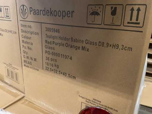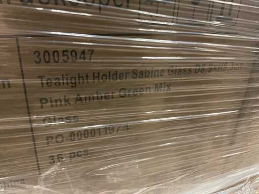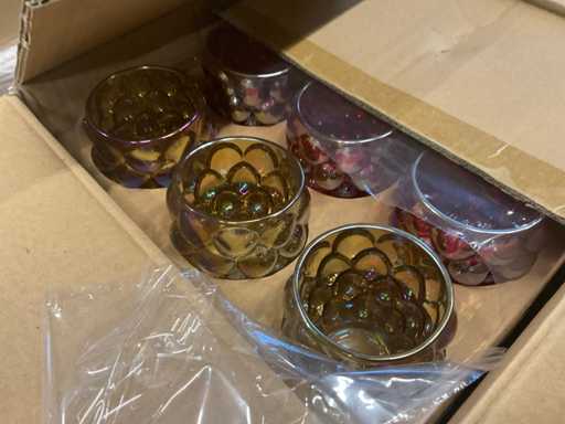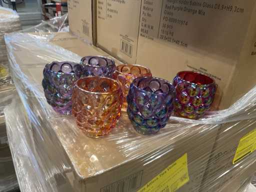 2 palety ze szklanymi uchwytami na tealighty w różnych kolorach, model Sabina D8,9xH9,3 cm, w kolorach czerwony, fioletowy, pomarańczowy mix i różowy bursztynowo-zielony, w tym palety.