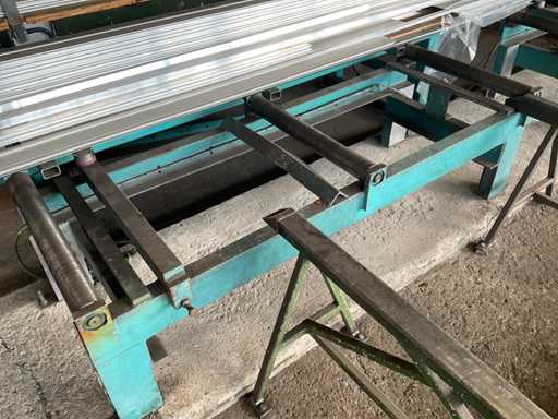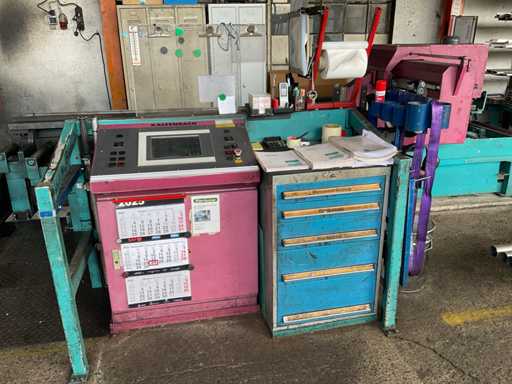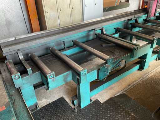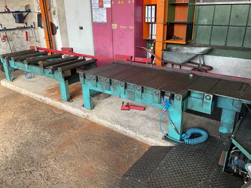 z przenośnikiem rolkowym, 3x jednostka podająca, 2x jednostka wyjściowa, podajnik, sterowanie, urządzenie chłodzące, szafa sterownicza.