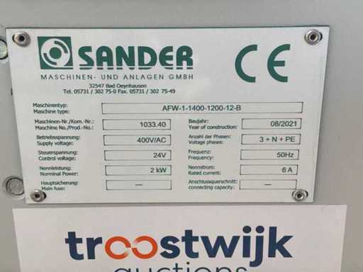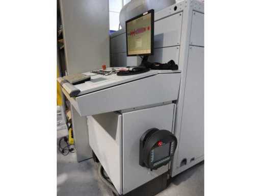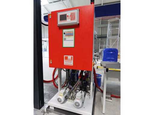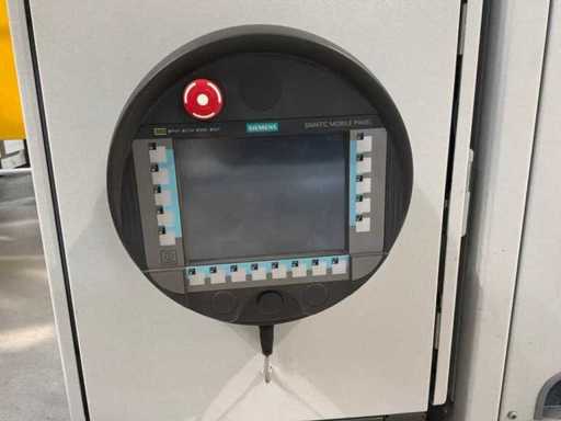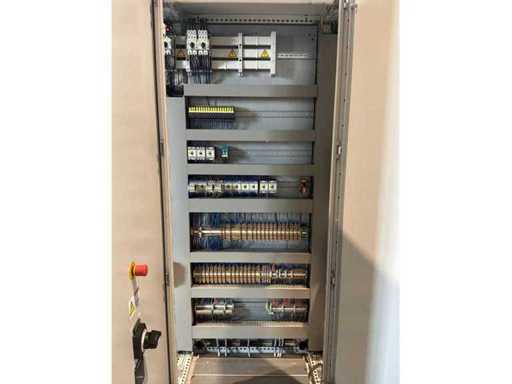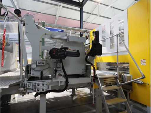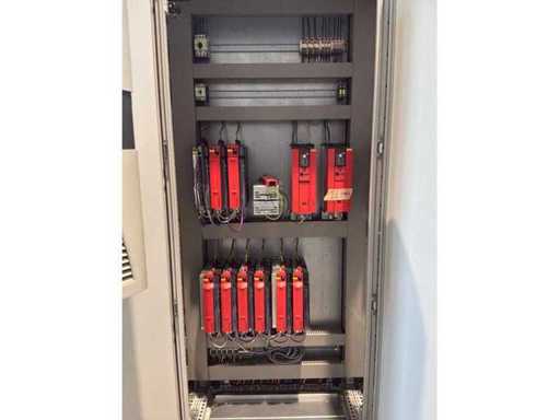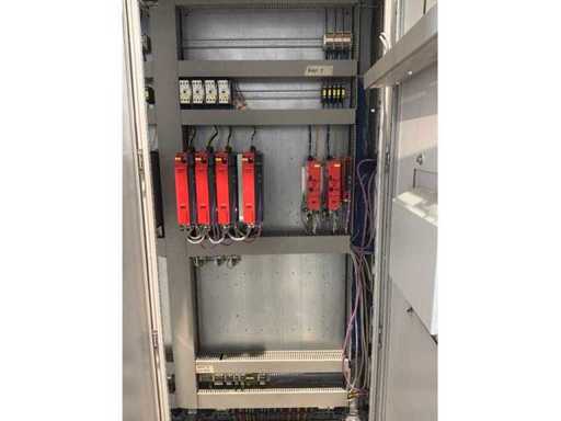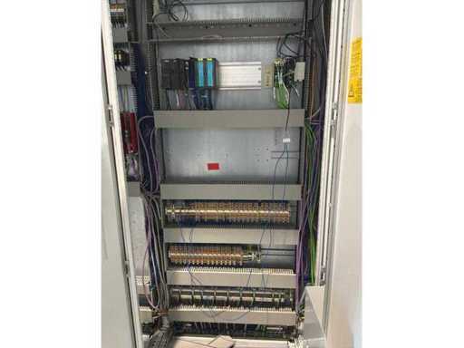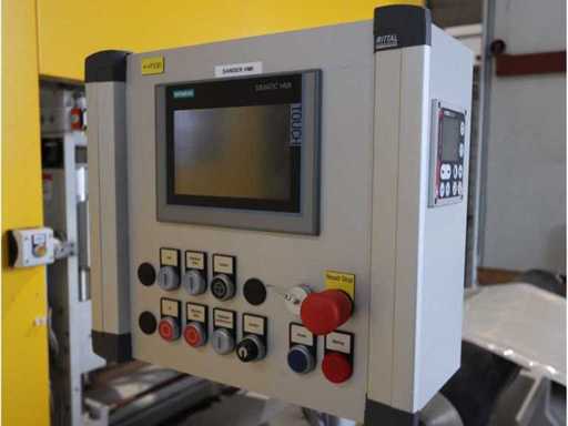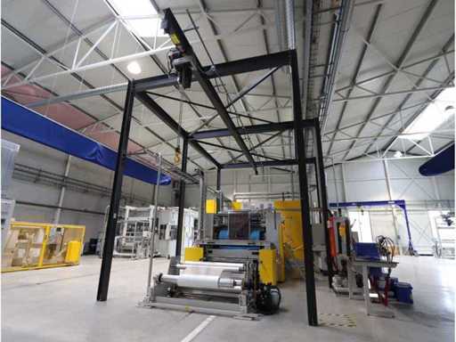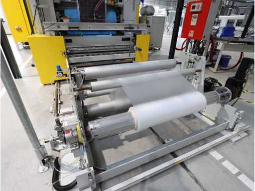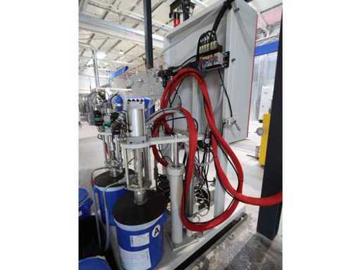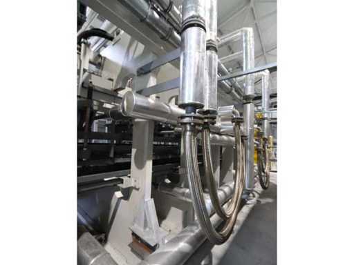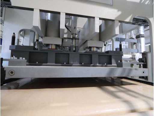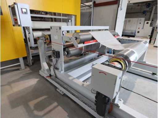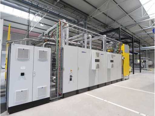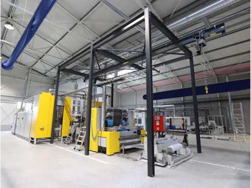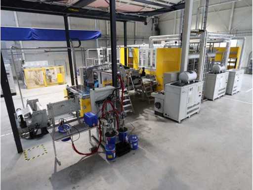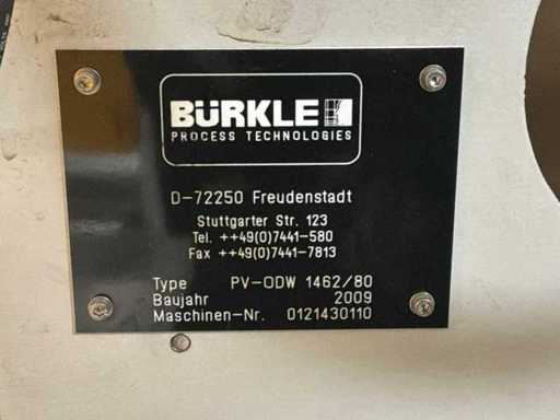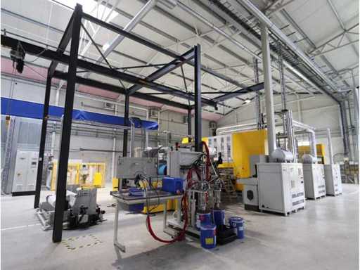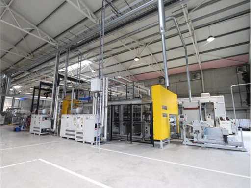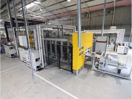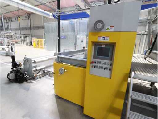 Typ PV-ODW 1462/80 wysokość operacyjna 0-80 mm, maksymalna prędkość operacyjna 6 m/min, maks. Siła nacisku 100 kN, maksymalna temperatura 200°C, wyposażona z: jednostkę rozwiniania, klej "Bürkle" typu EKM, moduł dozujący mieszankę kleju "2KM" typ PGM320, jednostkę odkręcającą, rolkowy wykręcacz typu AFW-1-1400-1200-12-B (2021) z dwudrzwiową szafą włącznikową, 3x nagrzewaczem oleju "Bürkle", centralną szafą przełącznikową z panelem dotykowym "Siemens" i symatyczną panelem mobilnym "Siemens", sześciodrzwiową szafą przełącznikową "Bürkle" oraz stałym portalem dźwigowym o nośności elektrycznej "SWF" 1000kg. Wykorzystana powierzchnia podłogi około 20,000x6000mm, całkowita masa około 62,000kg