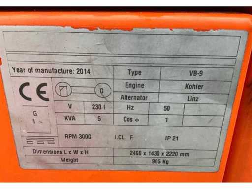 silnik Kohler; alternator linzki; 6x lampa LED o mocy 230W; Połączenie 230 V; 5 kVA; wbudowany zbiornik paliwa; maszt hydrauliczny; maksymalna wysokość masztu około 8 metrów; godziny czytania 1471 godzin; czujnik światła; szczeliny na widełki dla wózków widłowych; 4x regulowana stopa; lifting eye; Tylne światło? nie działa; (kupujący musi podać ważny numer rejestracyjny podczas transportu drogowego; 7-pinowy gniazdko lub adapter z kablem (przedłużacz można kupić na miejscu za opłatą); ewentualnie dodatkowy pasek świetlny); holenderskie dokumenty rejestracyjne; bez certyfikatu zgodności;