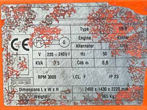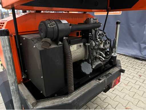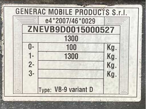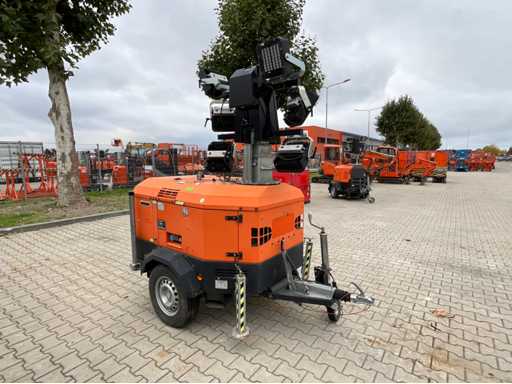 długość 2400 mm; szerokość 1450 mm; wysokość 2250 mm; Silnik wysokoprężny Kohler; Alternator Linz; 6x150 Watt Lampy LED; 230 woltów; maksymalna wysokość masztu 8 metrów; godziny czytania 860 godzin; czujnik światła; wyłącznik czasowy; szczeliny na widły wózka widłowego; 4x wysięgniki stabilizatora; wbudowany zbiornik paliwa; pojemność zbiornika 170 litrów; koło podporowe; warunki pracy; (Kupujący musi podać ważny numer rejestracyjny w przypadku transportu drogowego; 7 lub 9-pinową wtyczkę połączeniową lub adapter z kablem (przedłużacz można kupić na miejscu za opłatą); ewentualnie dodatkowy pasek świetlny); Belgijskie dokumenty rejestracyjne; certyfikat zgodności; (Q-ABN-536)