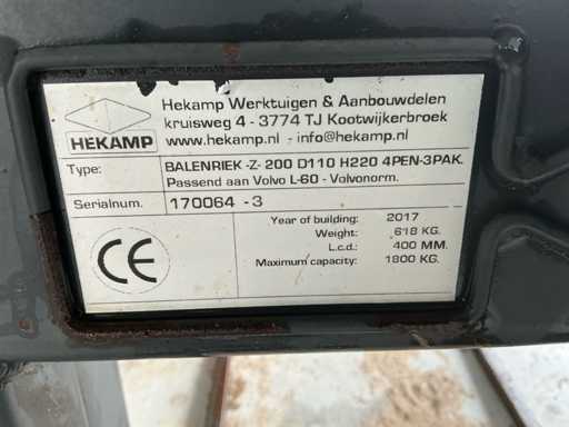 Wyposażony w: Hekamp balenriek Z-200 D110 H220 4PEN-3PAK (rok budowy 2017, numer seryjny 170064-3), waga 618 kg, udźwig 1 800 kg, środek ciężkości 400 mm, nadaje się do podłączenia Volvo L-60, posiada certyfikat CE i jest produkowany przez Hekamp Werktuigen & Aanbouwdelen