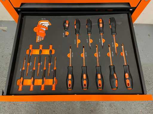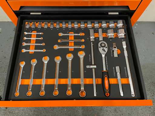 Wyposażony w 73 elementy; 3 szuflady; 2 koła skrętne; Nieużywany w pudełku