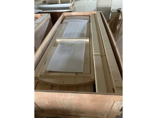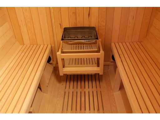 Wyposażony w 4-6 osobową saunę z werandą; w tym pokrycia dachowe; 6000 watów; Przyłącze 220 V; Sterowanie grzałką wewnętrzną 6 kw; światło przeciwwybuchowe; przezroczyste szkło hartowane o grubości 8 mm; drewniana rączka; Nieużywany w pudełku