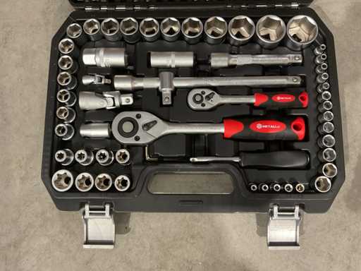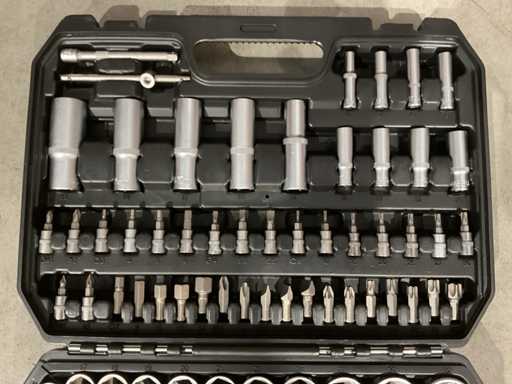 1/4" płaski frez na nasadce 4-5,5-6,5mm; 1/4" Torque na gniazdku T8-T10-T15-T20-T25-T27-T30; 1/4" Ratchet 72 zęby Szybkie zwalnianie; Przedłużenia 1/4" 50-100mm; Staw kolanowy 1/4"; 1/4'' dźwignia T; Spinner 1/4"; Gniazda 1/2" 10-11-12-13-14-15-16-17-18-19-20-21-22-24-27-30-32mm; Gniazda długości 1/2" 14-15-17-19-22mm; Gniazda Torx 1/2" E10-E11-E12-E14-E16-E18-E20-E24; 1/2" wiertwa imbusowe 7-8-10-12-14mm; 1/2" wiertła Philipsa PH.3-PH.4; 1/2" frezy Pozidriv PZ.3-PZ.4; Płaskie frezy 1/2" 8-10-12mm; Bit Torx 1/2" T40-T45-T50-T55-T60; Uchwyt na bit 1/2"; 1/2" Ratchet 72 zęby Szybkie zwalnianie; Przedłużenia 1/2" 125-250mm; Gniazdka 1/2" do świec zapłonowych 16-21mm; Staw kolanowy 1/2"; klucze L-klucze Allen 1,5-2-2,5mm; Nieużywane w pudełku (rozmiar transportowy 380 x 80 x 290, waga 6,52 kg)