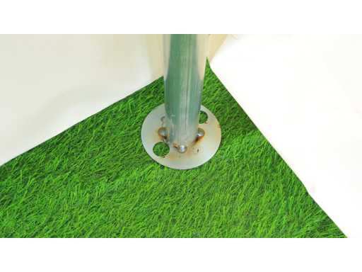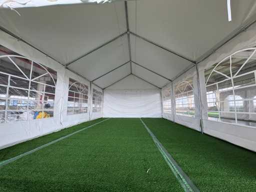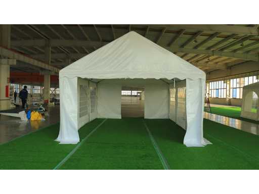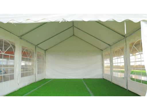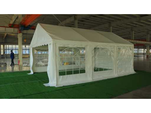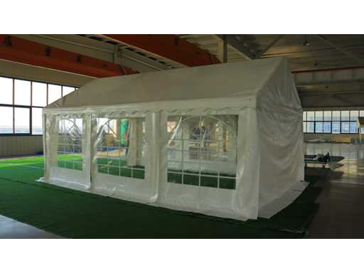 Wyposażony w wymiary 4x6x2,9m (szer. x dł. x wys.); Wysokość kalenicy 300cm; Wysokość wejścia 200cm; Szerokość wejścia: 300cm; Długość namiotu: 6m; Szerokość namiotu: 4m; Wysokość namiotu 2,9m; Nieużywane