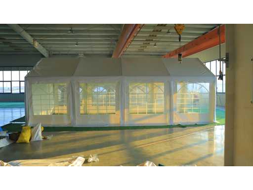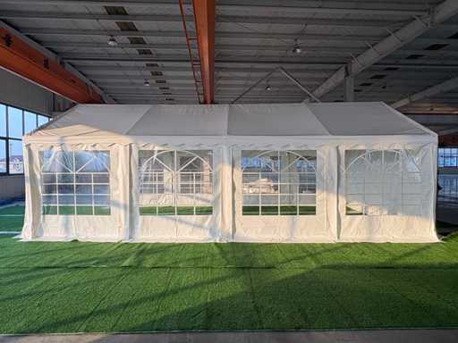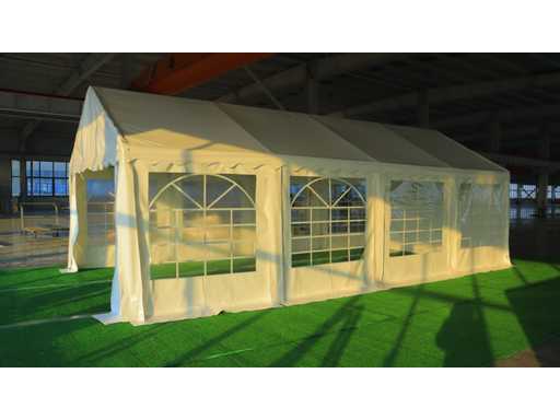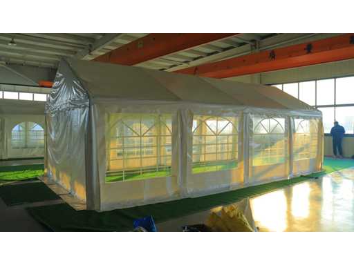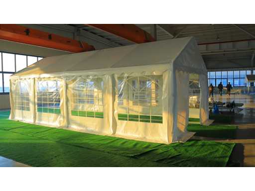 Wyposażony o wymiarach 4x8x2,9m (szer. x dł. x wys.); Wysokość kalenicy 300cm; Wysokość wejścia 200cm; Szerokość wejścia: 300cm; Długość namiotu: 8m; Szerokość namiotu: 4m; Wysokość namiotu 2,9m; Nieużywane