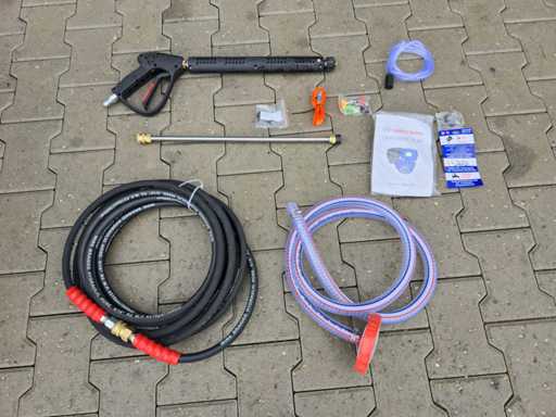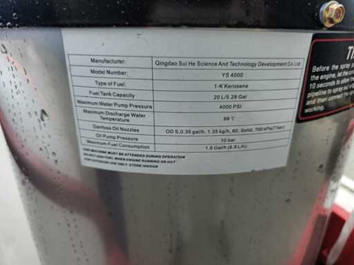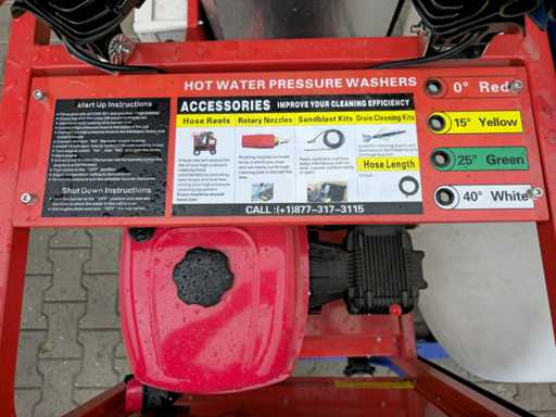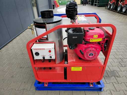 Wyposażony w ciepłą wodę ze zbiornikiem buforowym o pojemności 700 litrów; regulowana temperatura do 90 °C; System palników opalanych olejem napędowym ze stali nierdzewnej; maksymalne ciśnienie robocze 250 bar; 2x lampa robocza LED; zbiornik na wodę; długość węża wysokociśnieniowego 17 metrów; lanca natryskowa pod wysokim ciśnieniem; rozrusznik elektryczny; 4-suwowy silnik benzynowy o mocy 15 KM; 4 dodatkowe dysze; przyłącze zaworu Venturiego do dodawania cieczy chemicznej; Nieużywane