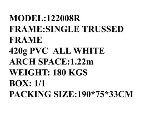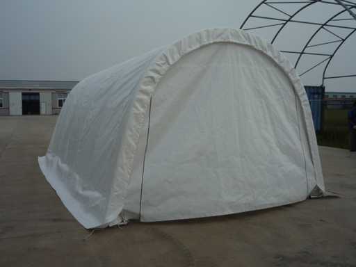 Wyposażony w namiot magazynowy / wiatę magazynową; system kratownicowo-rurowy obwodowy; Galwanizowane; oba końce drzwi; materiał: 420 gramów, pokrowiec z PVC; kolor biały; wraz z instrukcją montażu; Nieużywany w metalowym pudełku (wymiary transportowe 190x75x33 cm)