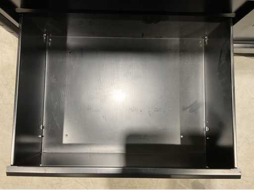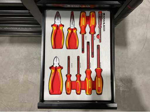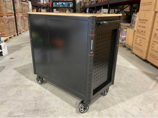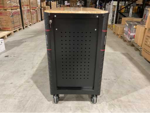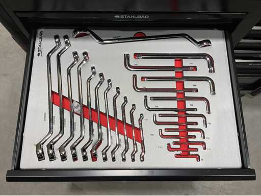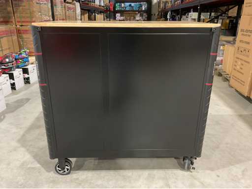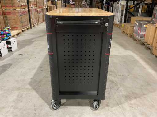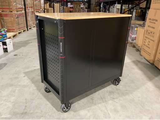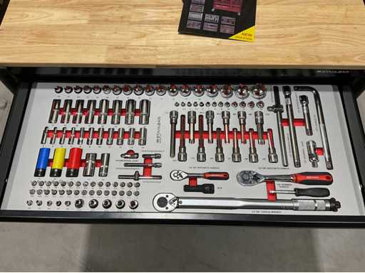 Wyposażony w 13 szuflad, z których 10 wypełnionych jest narzędziami; profesjonalne narzędzia chromowo-wanadowe; wózek narzędziowy o dużej wytrzymałości; drewniany blat; 4 koła; solidny uchwyt; nieużywany w pudełku (wymiary transportowe 115x50x100 cm)