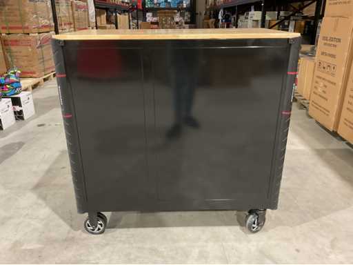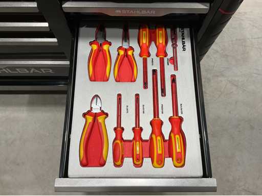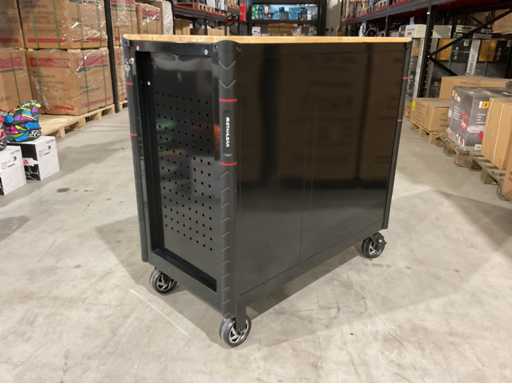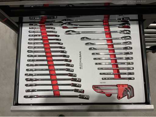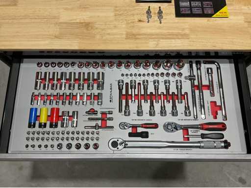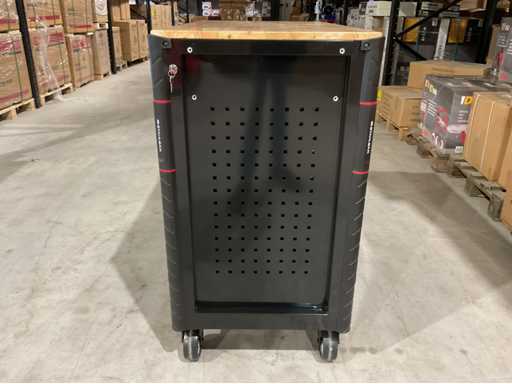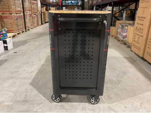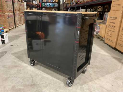 Wyposażony w 13 szuflad, z których 10 wypełnionych jest narzędziami; profesjonalne narzędzia chromowo-wanadowe; wózek narzędziowy o dużej wytrzymałości; drewniany blat; 4 koła; solidny uchwyt; nieużywany w pudełku (wymiary transportowe 115x50x100 cm)