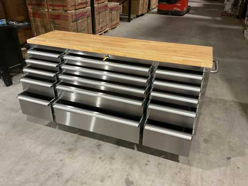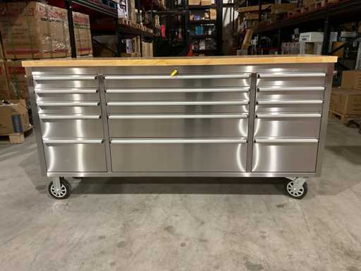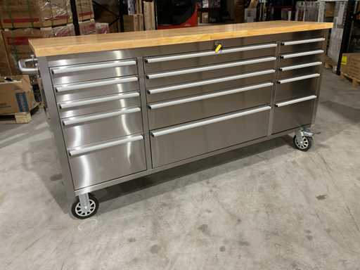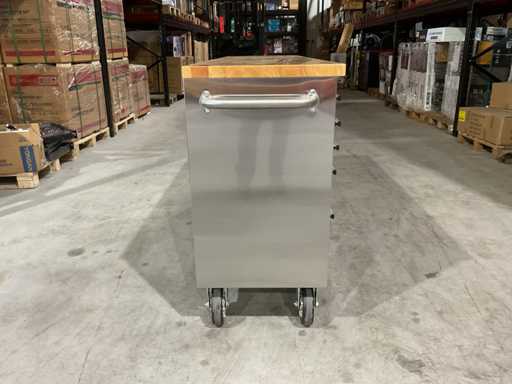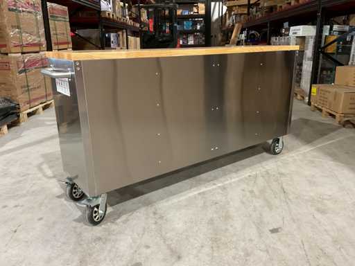 Wyposażony w całą stal nierdzewną 430 zapobiegającą odciskom palców; 15 szuflad; Blat drewniany 35 mm; 2 uchwyty; 4 x 6-calowe koła, w tym 2 koła z hamulcami; zamykany na klucz; Nieużywany w pudełku (wymiary transportowe 190x55x90 cm)
