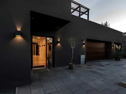 uszczelnienie IP65, regulowany kąt wiązek światła, kolor światła 3000K ciepła biel, luminiscenizm 600 lumenów, COB LED, materiał aluminium z materiału, oświetlenie górne i dolne, przyciemnione. 100mm x 100mm x 100mm, napięcie 220-240V, żywotność 20000 godzin, montaż w zestawie, odpowiedni do użytku wewnątrz i na zewnątrz, SKU 1166