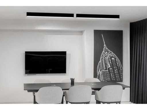 Oprawa wisiorkowa lub oświetlająca miejsce pracy lub biurko, może być używana jako lampa wisiorkowa lub montowana bezpośrednio na suficie, a dostawa obejmuje pasujący zestaw zawieszenia. Wyposażony w mocowe źródło światła LED A++ z dyfuzorem opalowym, rozmiar ok: 125 x 2,8 x 6,8 cm. Źródło światła 40 watów LED. Połączenie 230V. Kolor zewnętrzny, wnętrze białe. Materiał: aluminium, plastik. To nowy produkt