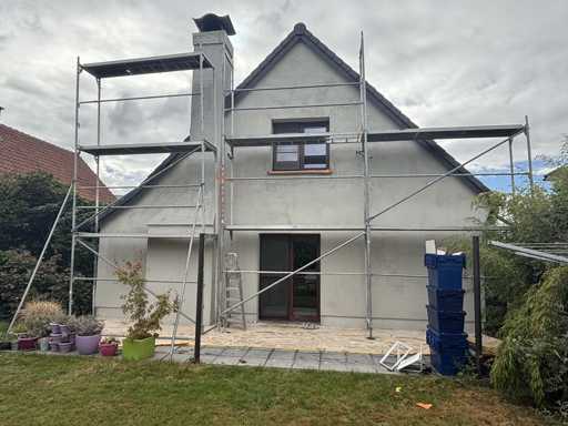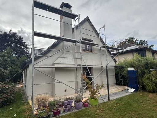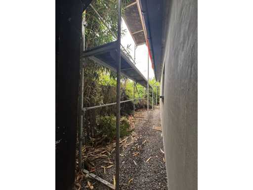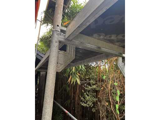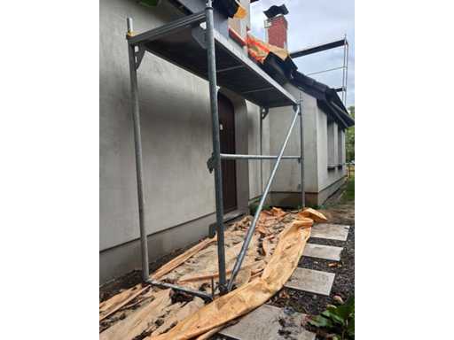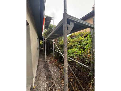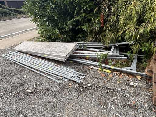 The buyer is responsible for dismantling the rack. Complete with already dismantled ditto scaffolding parts including: 7 surface-mounted frames approx. 2000 x 780cm, 2 platforms, 14 different braces