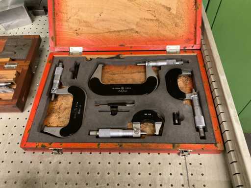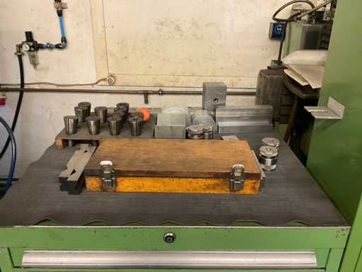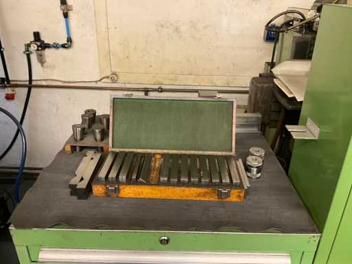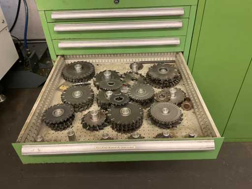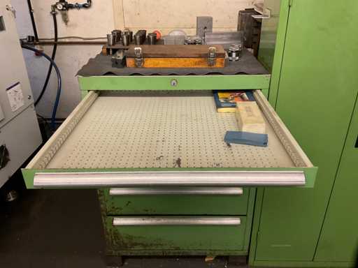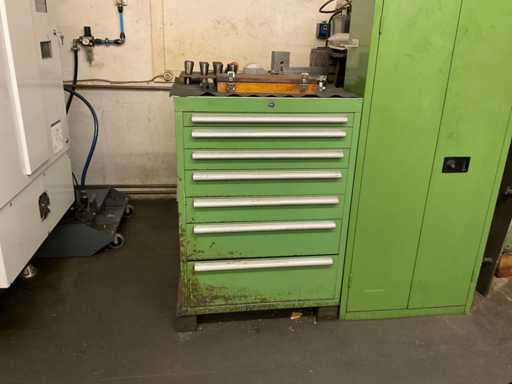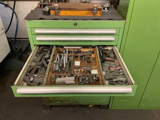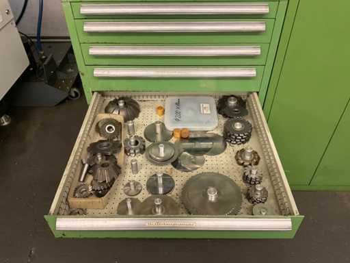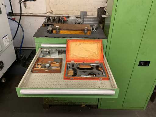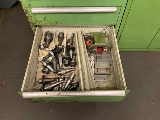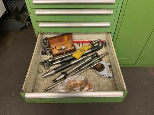Drawer cabinet 7-compartment with contents, consisting of: e.g. MITUTOYO micrometer various sizes, various clamping devices, disc cutter various variants, various SK mounts