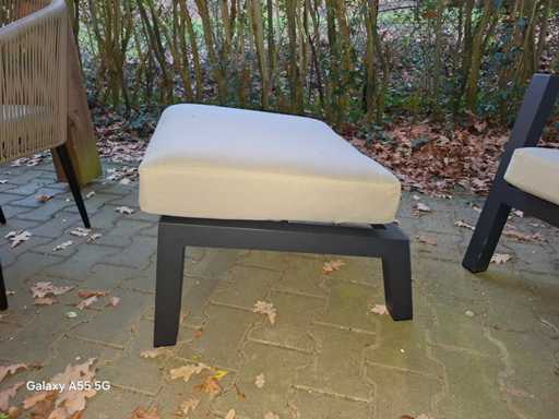 Pasujący podnóżek dopełnia zestaw i zapewnia dodatkowy komfort. Wyposażony jest także w matową czarną aluminiową ramę oraz wygodną, kremowo-białą poduszkę, która dzięki wygodnym pętlom mocno trzyma się na miejscu. Pochylony kształt wspiera relaksującą pozycję siedzącą.