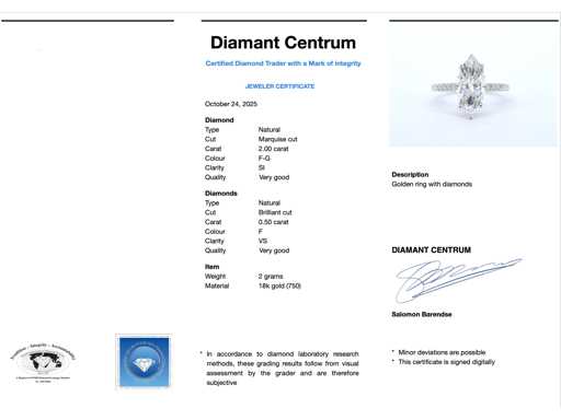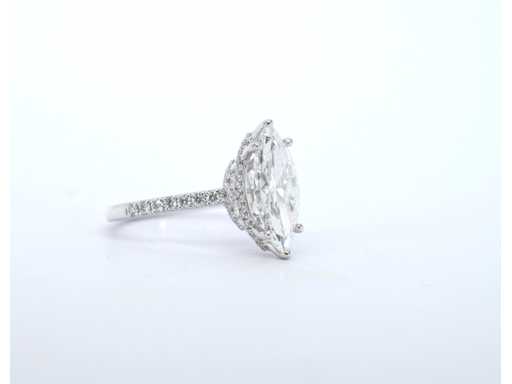 diamentem Halo: Naturalny; Ilość: 1 sztuka; Cięcie: Cięcie Marquise; Waga (karat): 2,00; Kolor: F-G; Czystość: SI; Jakość cięcia: bardzo ładna; Diament (drugoplan): Naturalny; Liczba diamentów: 54 pionki; Cięcie: Brilliant cut; Waga (karat): 0,50 karata; Kolor: F; Czystość: USA; Jakość cięcia: Bardzo ładna; Klejnot: Pierścionek; Waga: 3 gramy; Rozmiar pierścienia (wykonany na zamówienie*): 53 (17 mm); Materiał: 18K gold (750); Stan zdrowia: Nowy; Pakowanie: Luksusowa szkatułka na biżuterię; Wyjaśnienie: Jakość została zaczerpnięta z raportu dotyczącego przedmiotu. Wycena to ocena certyfikowanego dealera diamentów, oparta na cenach konsumpcjalnych; Cena konsumencka: € 60 900