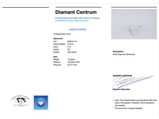 Diament: naturalny; Ilość: 16 sztuk; Cięcie: Brilliant cut; Waga (karat): 0,45 karata; Kolor: F-G; Czystość: USA; Jakość cięcia: Bardzo ładna; Klejnot: Pierścionek; Waga: 1,6 uncji; Rozmiar pierścienia (wykonany na zamówienie*): 53 (17 mm); Materiał: 18K gold (750); Stan zdrowia: Nowy; Pakowanie: Luksusowa szkatułka na biżuterię; Wyjaśnienie: Jakość została zaczerpnięta z raportu dotyczącego przedmiotu. Wycena to ocena certyfikowanego dealera diamentów, oparta na cenach konsumpcjalnych; Cena konsumencka: € 2 940