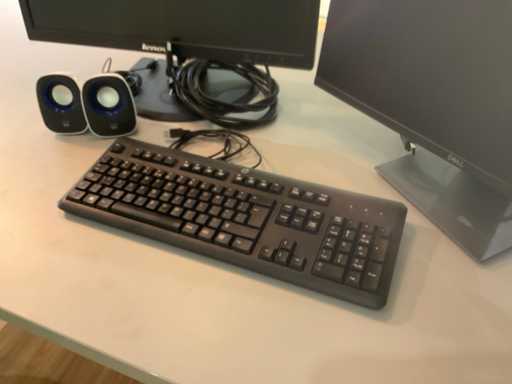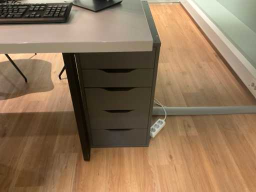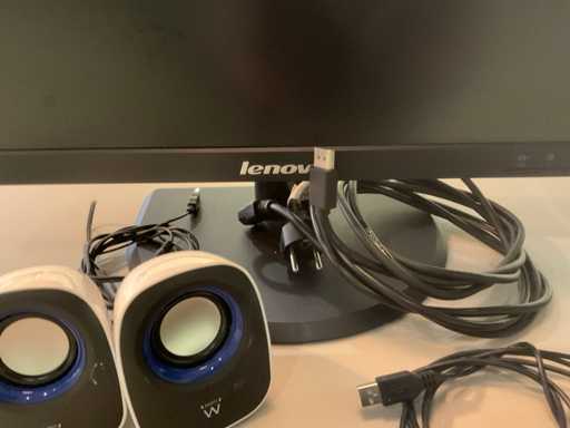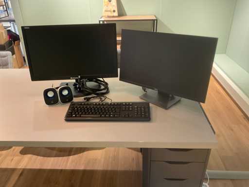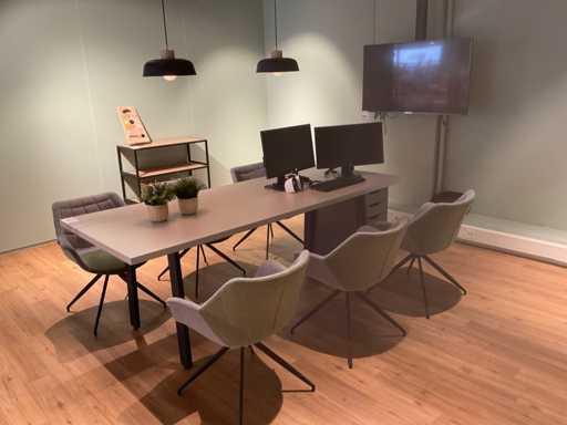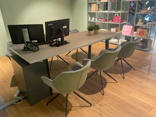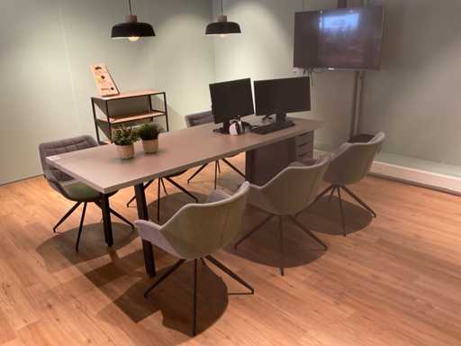 Składa się ze stołu ok. 225x90x80 cm, 6 krzeseł tapicerowanych zielono-szarych, 3 elewacji ok. 90x40x30 cm z komodą, 2 monitorów z klawiaturą, myszką i zestawem głośników wraz z 2 lampami wiszącymi, bez ekranu i szyny oświetleniowej ze spotami.