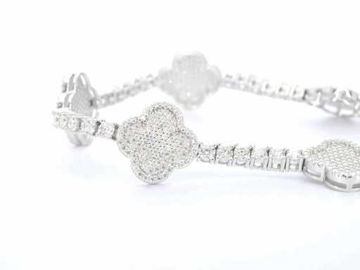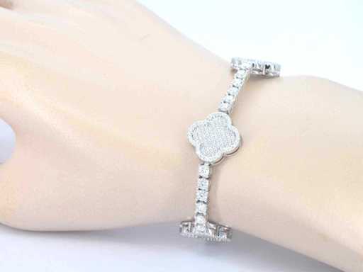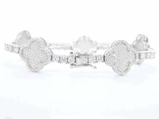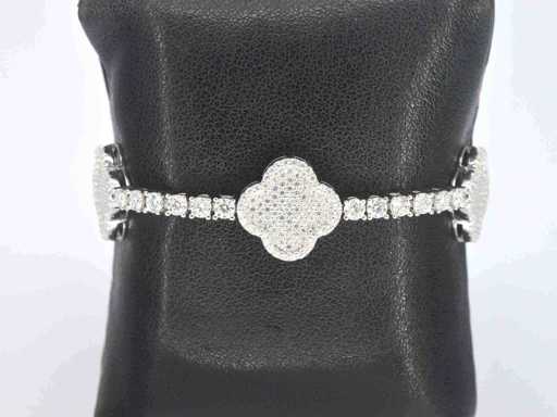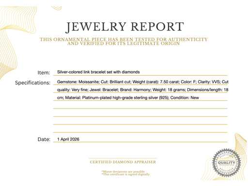 brylantami: moissanite; Cięcie: Brilliant cut; Waga (karat): 7,50 karat; Kolor: F; Czystość: VVS; Jakość cięcia: Bardzo ładna; Klejnot: Bransoletka; Marka: Harmony; Waga: 18 gramów; Wymiary/długość: 18 cm; Materiał: Platynowe srebro wysokiej klasy (925); Stan zdrowia: Nowy; Pakowanie: szkatułka na biżuterię lub aksamitne pudełko; Wyjaśnienie: Jakość została zaczerpnięta z raportu dotyczącego przedmiotu. Wycena to ocena certyfikowanego dealera diamentów, oparta na cenach konsumpcjalnych; Dodatkowe informacje: Zmierzona waga kamieni szlachetnych jest według rozmiarów diamentów; Cena konsumencka: € 2 000