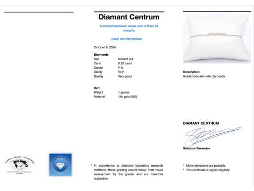 Diament: naturalny; Ilość: 11 sztuk; Cięcie: Brilliant cut; Waga (karat): 0,20 karata; Kolor: F-G; Czystość: SI-P; Jakość cięcia: Bardzo ładna; Klejnot: Bransoletka; Waga: 1 gram; Wymiary/długość: 17,5 cm; Materiał: 14-karatowe złoto (585); Stan zdrowia: Nowy; Pakowanie: Luksusowa szkatułka na biżuterię; Wyjaśnienie: Jakość została zaczerpnięta z raportu dotyczącego przedmiotu. Wycena to ocena certyfikowanego dealera diamentów, oparta na cenach konsumpcjalnych; Cena konsumencka: € 1 470
