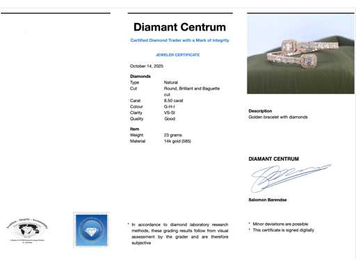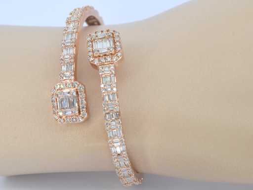 Diament: naturalny; Ilość: ok. 280 sztuk; Cięcie: okrągłe, błyskotliwe i baquette; Waga (karat): 8,50 karat; Kolor: G-H-I; Czystość: VS-SI; Jakość grindowania: Dobra; Klejnot: Bransoletka; Waga: 23 gramy; Wymiary/długość: 58 mm średnica elasyczna; Materiał: 14K gold (585); Stan zdrowia: Jakby nowy; Pakowanie: Luksusowa szkatułka na biżuterię; Wyjaśnienie: Jakość została zaczerpnięta z raportu dotyczącego przedmiotu. Wycena to ocena certyfikowanego dealera diamentów, oparta na cenach konsumpcjalnych; Cena konsumencka: € 43 750