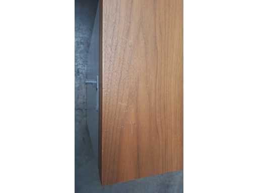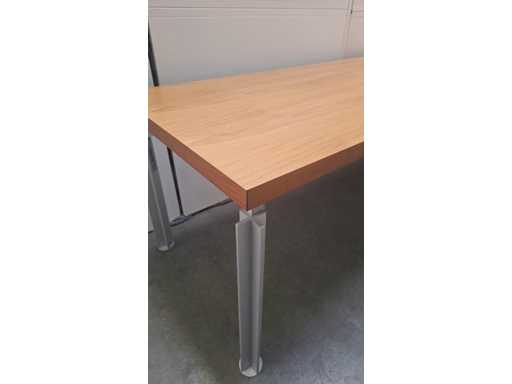 Solidne dachy wykończone fornirem wiśniowym, aluminiową podstawą, stałą jednostką szufladową z 4 szufladami oraz zamkiem kodowym BULOSAFE, a blat wykazuje ślady zużycia i przebarwień (zobacz zdjęcia)