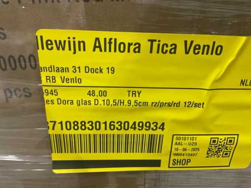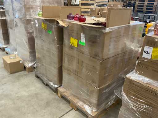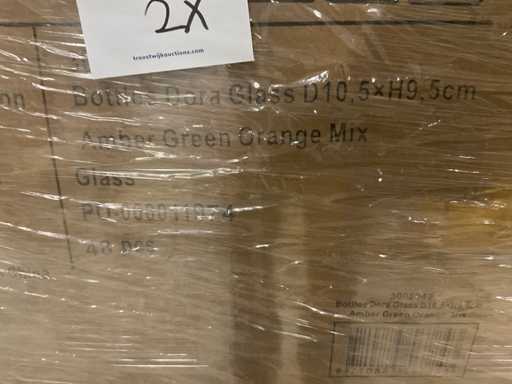 2 palety ze szklanymi butelkami w różnych kolorach, model Dora D10,5xH9,5 cm, w kolorach zakłopotany różowy mix i zielony pomarańczowy mix, wraz z paletami.