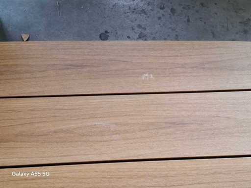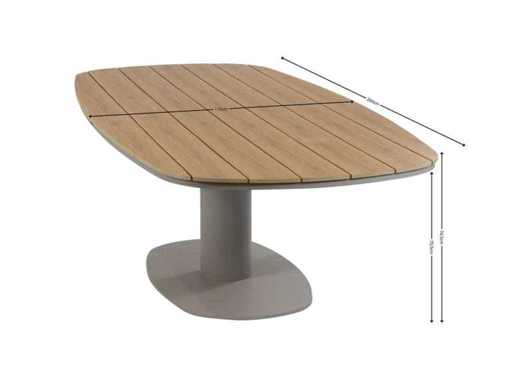 Ten piękny stół oferuje stylowy i nowoczesny wygląd, który idealnie pasuje do różnych otoczeń na zewnątrz – od przytulnych rodzinnych ogrodów po tarasy biznesowe. Górna deska, o długości nie mniejszej niż 260 cm, wykonana jest z teku Tecon, wysokiej jakości materiału, który łączy ciepły wygląd prawdziwego drewna tekowego z łatwością konserwacji drewna polierenowego.