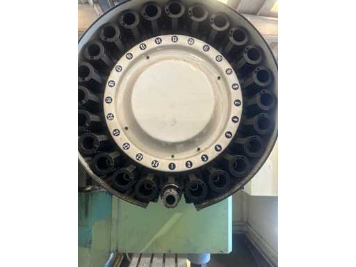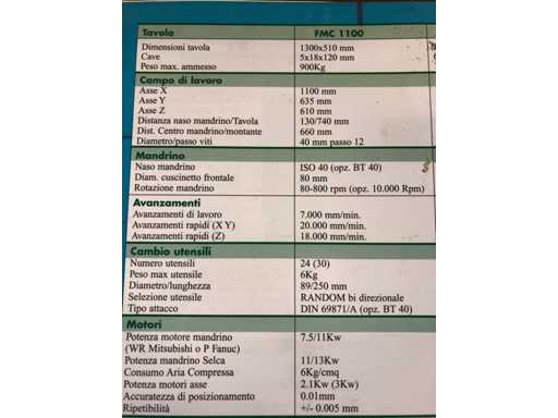 Wymiar stołu 1300 x 510 mm, maksymalna masa obrabianego elementu 900 kg, zakres pracy X1100 mm, Y635 mm, Z610 mm, magazyn narzędziowy na 24 miejsca, stożek ISO40, wraz z przenośnikiem wiórowym, obecne instrukcje, imadła i narzędzia niedostępne