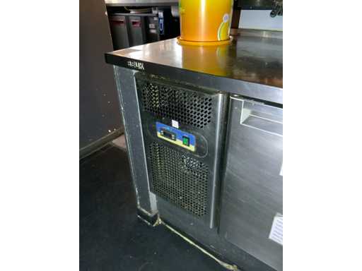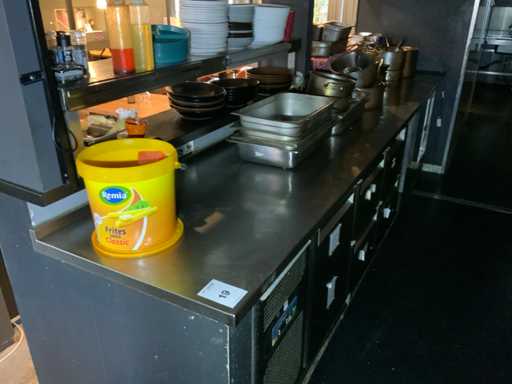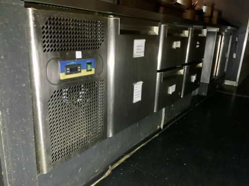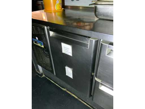 Składa się z: chłodniczego stołu warsztatowego z 1x drzwiami, 4x szufladą i wbudowaną sprężarką chłodniczą, 230 woltów, wymiary około: 1900x700x880 mm i szafy grzewczej, wyposażonej w drzwi przesuwne, 230 woltów, wymiary około: 1000x700x880 mm. Zawiera blat ze stali nierdzewnej o wymiarach około: 3700x720 mm. Elementy znajdujące się na blacie nie są wliczone w cenę.