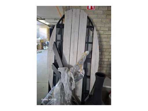 Stół ma wymiary owalne 220 cm, a na górze ma wysokość 74 cm. Stół ogrodowy wyposażony jest w solidną nogę X i deski o szerokości 16 cm. Wokół tego stołu można ustawić 6-8 krzeseł. Zastosowanie szerokich desek nadaje temu stołowi ogrodowemu solidny wygląd.