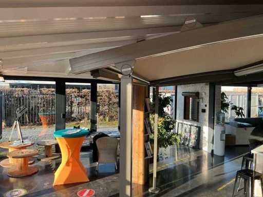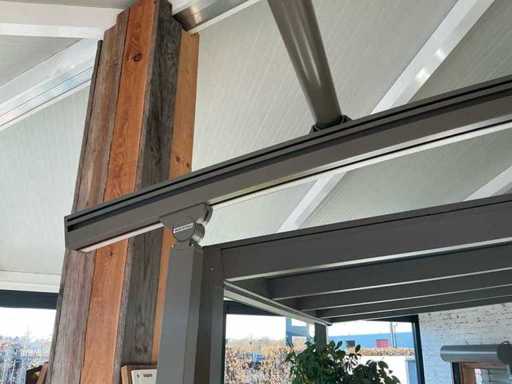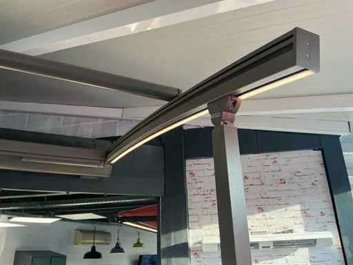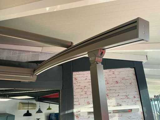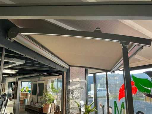 Składa się z: zadaszenia tarasowego, 2 słupków stojących o wysokości 2250 mm, najwyższego punktu 2520 mm, oświetlenia LED z taśmą LED, elektrycznie sterowanego górnego rogu, elektrycznego materiałowego przodu, który zostanie profesjonalnie rozebrany przez sprzedawcę po zakupie, jest to nowy model salonowy.