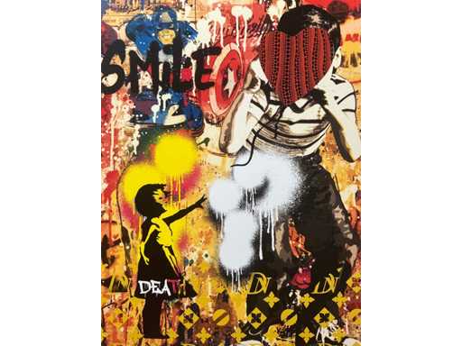 His unique style evokes the influences of Banksy, Basquiat, Warhol and Murakami, combining provocation, humour and urban aesthetics.