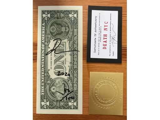 • Hand-dated, signed and numbered work. Made on a real US dollar. Format: 15.7 x 6.8 cm. Limited edition of 100 pieces. Certificate of authenticity and artist's dry-gilt stamp