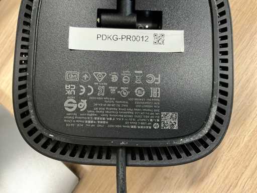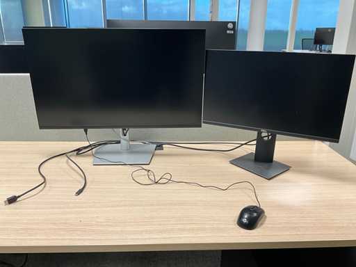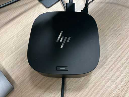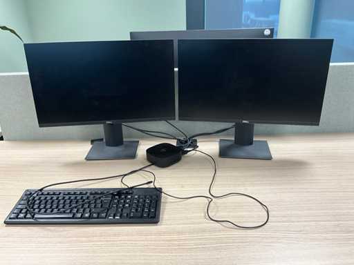 Składa się z różnych monitorów, w tym: 3x Dell P3222QE i 3x Dell P2419H, klawiatur i myszy oraz 1x HP USB-C Dock G5.