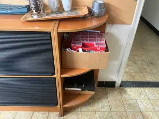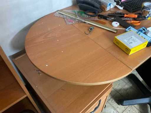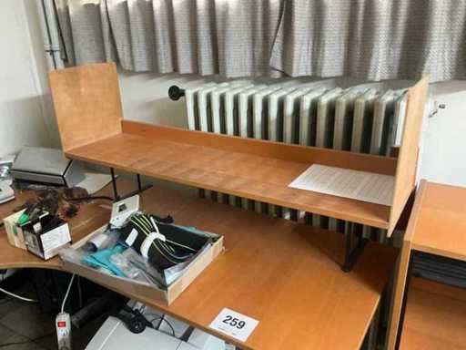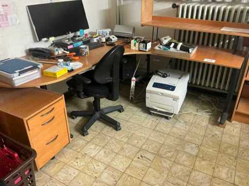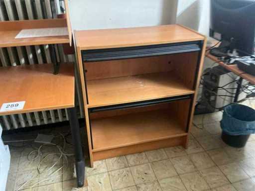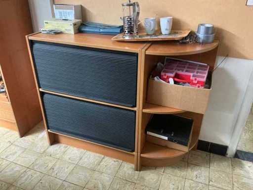 Without content. With office chair and drawer unit Without computer and screen. Includes 2x cabinet with double roller shutter dimensions 84x42x100 cm. Semi-circular finish. Open shelf 84x42x220 cm.