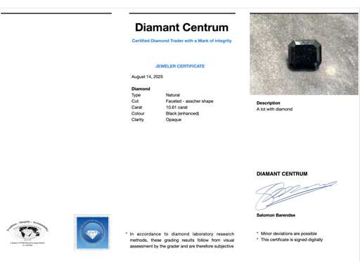 diament Diament: naturalny; Ilość: 1 sztuka; Cięcie: Fasetowane – kształt asher; Waga (karat): 10,61 karata; Kolor: (ulepszony); Czystość: Nieprzezroczysta; Stan zdrowia: Nowy; Pakowanie: Gem Box; Wyjaśnienie: Jakość została zaczerpnięta z raportu dotyczącego przedmiotu. Wycena to ocena certyfikowanego dealera diamentów, oparta na cenach konsumpcjalnych; Cena konsumencka: € 4 950