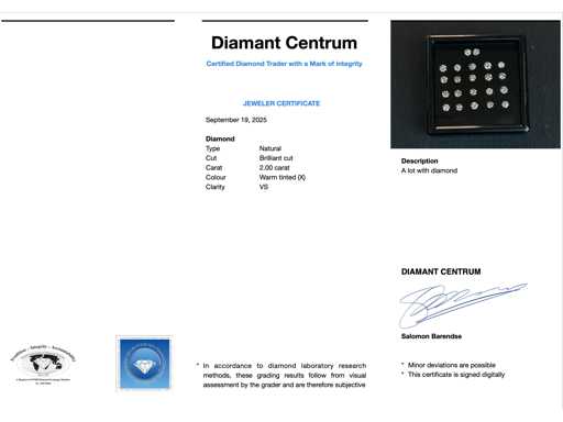 Diament: naturalny; Ilość: 22 sztuki; Cięcie: Brilliant cut; Waga (karat): 2,00 karat; Kolor: ciepły przyciemnienie (X); Czystość: USA; Stan zdrowia: Nowy; Pakowanie: Gem Box; Wyjaśnienie: Jakość została zaczerpnięta z raportu dotyczącego przedmiotu. Wycena to ocena certyfikowanego dealera diamentów, oparta na cenach konsumpcjalnych; Cena konsumencka: € 4 950