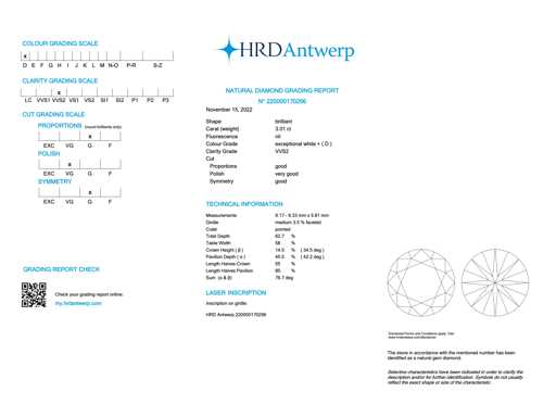 Diament: naturalny; Ilość: 1 sztuka; Cięcie: Brilliant cut; Waga (karat): 3,01 karata; Kolor: D; Czystość: VVS2; Certyfikat: HRD; Numer certyfikatu: 220000170296; Stan zdrowia: Nowy; Pakowanie: Gem Box; Wyjaśnienie: Jakość została zaczerpnięta z raportu dotyczącego przedmiotu. Wycena to ocena certyfikowanego dealera diamentów, oparta na cenach konsumpcjalnych; Cena konsumpcja: € 248 000