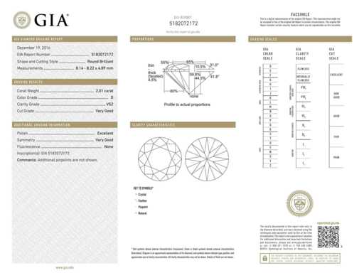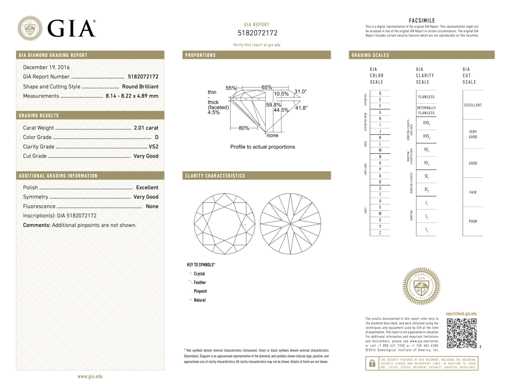 Diamond: Natural; Quantity: 1 piece; Cut: Brilliant cut; Weight (carat): 2.01 carat; Color: D; Purity: VS2; Certificate: GIA; Certificate number: 5182072172; Condition: New; Packing: Gem Box; Explanation: The quality has been taken from the report belonging to the item. The valuation is an assessment of a certified diamond dealer, based on consumer prices; Consumer price: € 99,200