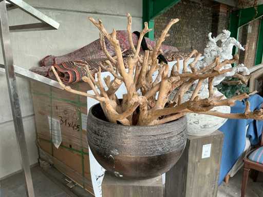 Drewniana kolumna o wymiarach 30x30x80 cm z kamienną doniczką i ozdobnym elementem.