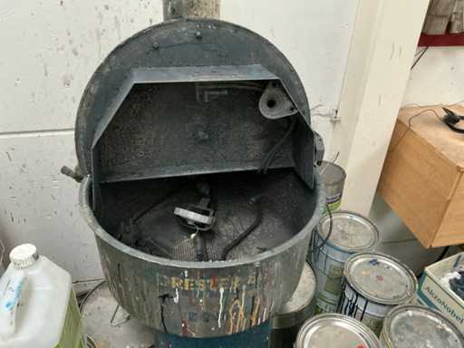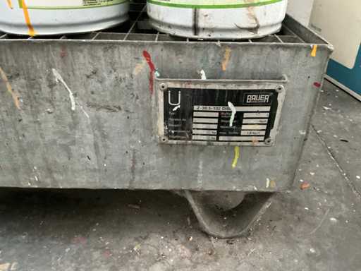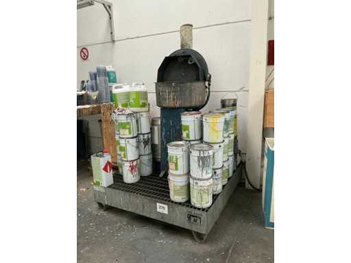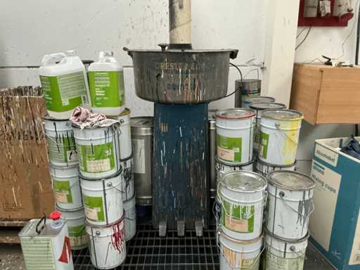 Equipped with foot control and drip tray BAUER 3033 complete with batch of various addressed paint pots including AKZONOBEL in various colors with a total arrangement of approx. 120 x 120 x 190 cm