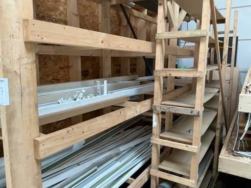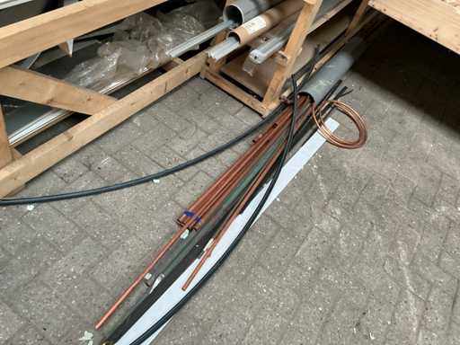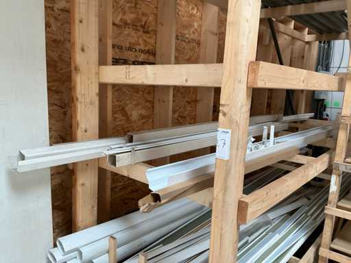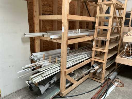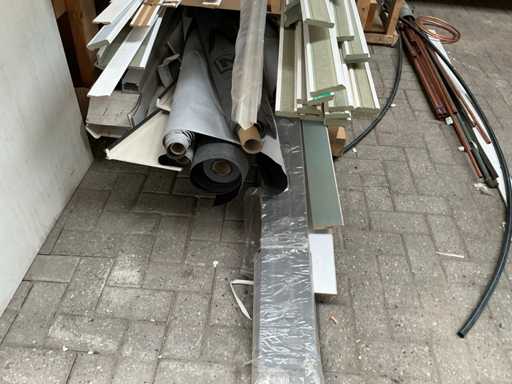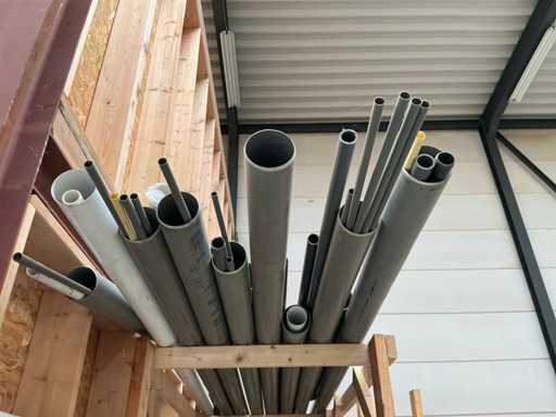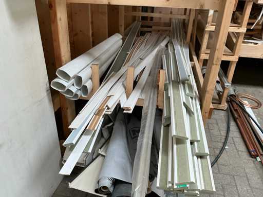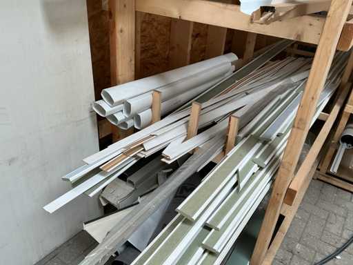 Zawartość obejmuje różne listwy przypodłogowe, miedziane rury wodne, rury odpływowe z PVC, kanały plastikowe itd.