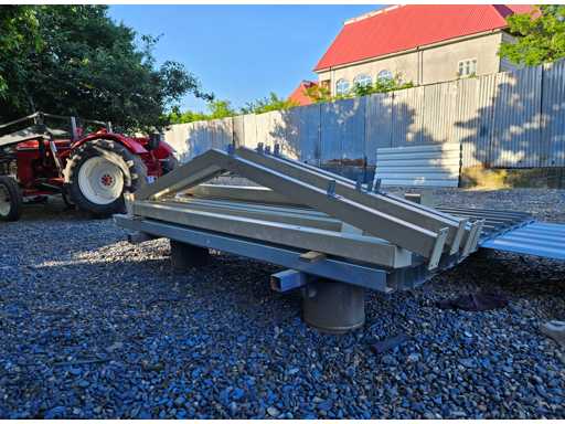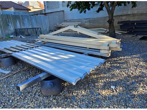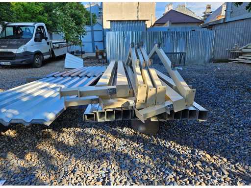 Dodatkowe informacje Dodatkowe informacje Konstrukcje metalowe; Konstrukcja składa się z: 4 kratownic wykonanych z rur prostokątnych o wymiarach 100x50x3; 8 filarów wykonanych z rur kwadratowych o wymiarach 100x100x3; 2 filary nośne z profilu C 100 oraz poprzeczka drzwiowa z profilu C 100 i poprzeczka drzwiowa z profilu C 100, łączące kliny na kratownice z ocynkowanego profilu C 100; Konstrukcja jest zdejmowalna, na śrubach; Stan zdrowia: nieużywany; Budowa obejmuje certyfikat zgodności, rysunek konstrukcyjny; Darmozjad." Nie obejmuje blachy... Darmozjad.